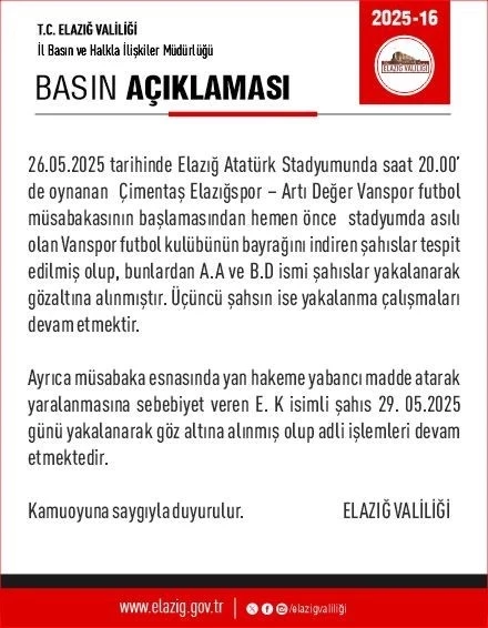Elazığ Valiliğinden yapılan açıklamada, 26 Mayıs’ta Elazığ Atatürk Stadyumu’nda saat 20.00’de oynanan Çimentaş Elazığspor-Artı Değer Vanspor futbol müsabakasının başlamasından hemen önce stadyumda asil olan Vanspor futbol kulübünün bayrağını indiren şahısların tespit edildiği belirtildi. Açıklamada, ’’Şahıslardan A.A. ve B.D. yakalanarak gözaltına alınmıştır. Üçüncü şahsın ise yakalanma çalışmaları devam etmektedir. Ayrıca müsabaka esnasında yan hakeme yabancı madde atarak yaralanmasına sebebiyet veren E.K. isimli şahıs 29 Mayıs’ta yakalanarak gözaltına alınmış olup, adli işlemleri devam etmektedir’’ denildi.