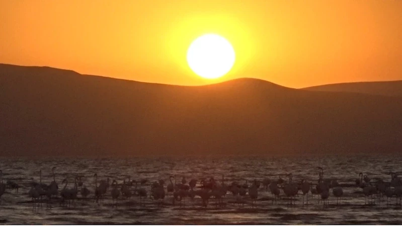Van’ın doğusunda yer alan Erçek Gölü, güneşin kızıla boyandığı o anlara flamingoların dansının eşlik etmesiyle adeta görsel bir şölen sundu.