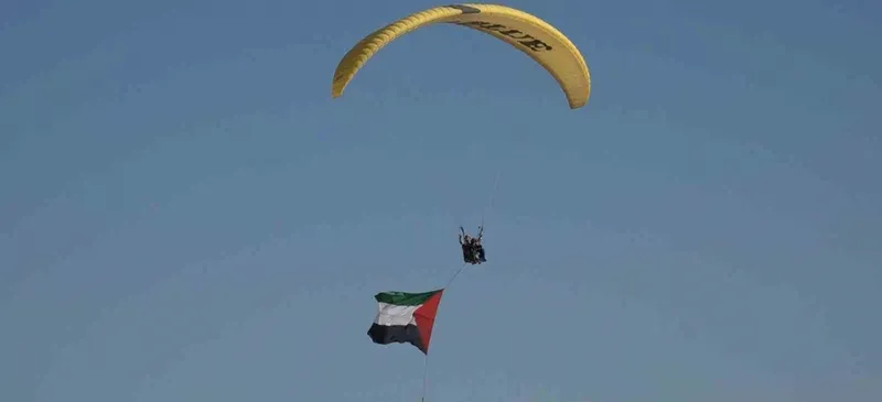 Antalyalı Yamaç Paraşütü Pilotu Mehmet Sadık Göller, takım arkadaşıyla birlikte Van Gölü semalarında Filistin bayrağı açtı.