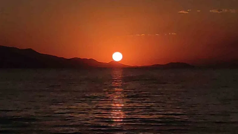 Van Gölü, akşam saatlerinde güneşin kızıla bürünerek batışıyla etkileyici bir manzaraya sahne oldu. Gökyüzünün turuncu ve kızıl tonlara boyandığı anlar, gölün berrak sularına yansıyarak adeta kartpostallık görüntüler ortaya çıkardı.