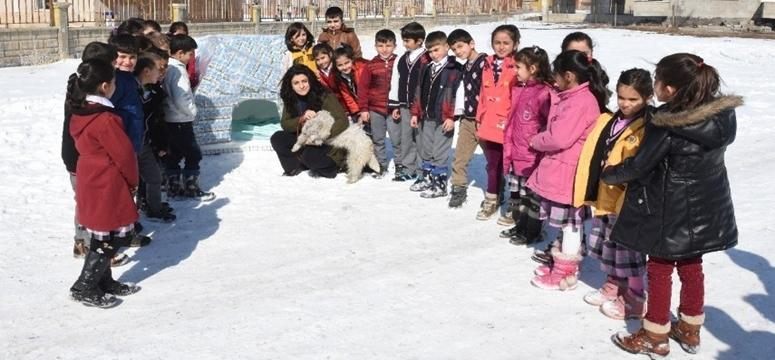 Van’ın Tuşba ilçesindeki Akköprü İlkokulu 3. sınıf öğrencileri, bakanlık tarafından dağıtılan süt kutularından yaptıkları ilk kulübe, bir sokak köpeğine barınak oldu.