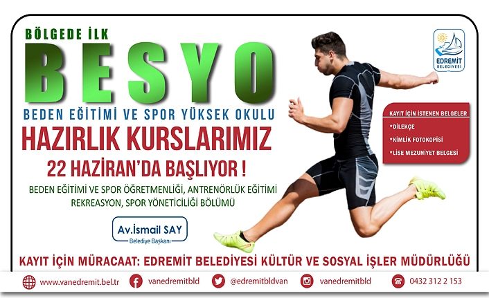Edremit Belediyesi sosyal medya hesabından yapılan açıklamada, "Bölgede ilk ! Beden eğitimi ve spor yüksek okulu (BESYO) hazırlık kurslarımız 22 haziran’da başlıyor! Beden eğitimi ve Spor öğretmenliği , Antrenörlük eğitimi , Rekreasyon, Spor yöneticiliği bölümü Kayıtlarımız başlamıştır. Geç kalmayın." ifadeleriyle yer verildi.