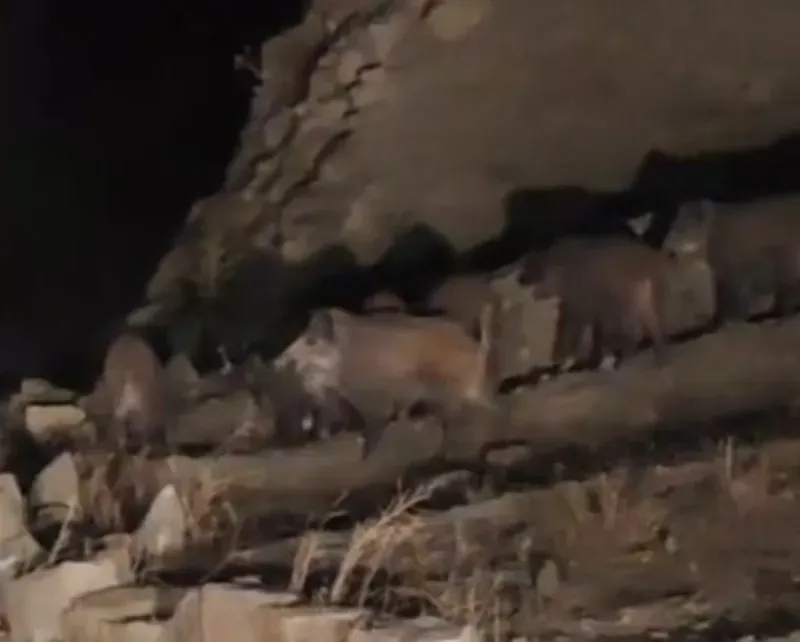Başkale ilçesine 50 kilometre uzaklıkta bulunan İran sınırındaki kırsal Esenyamaç Mahallesi’ne akşam saatlerinde yaban domuzu sürüsü indi. Mahallede ikamet eden Mustafa Özdemir, yolun kenarında yiyecek arayan sürüyü cep telefonu kamerasıyla görüntüledi. Yaklaşık 10 domuzun bulunduğu sürü, yolun karşısına geçtikten sonra gözden kayboldu.