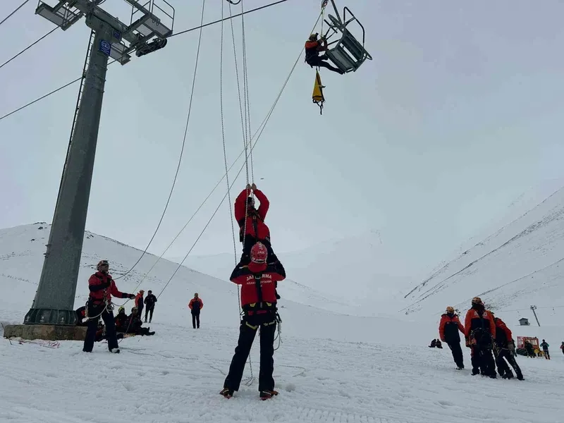 Senaryo gereği kayak merkezinde meydana gelen çığ nedeniyle elektrik kesintisi yaşanırken, telesiyejde 4 kişi mahsur kaldı. Olay yerine sevk edilen ekipler, telesiyejde mahsur kalanları güvenli şekilde tahliye ederek aşağı indirdi.