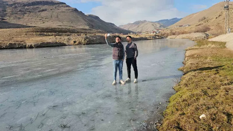 Van’ın Erciş ilçesinde etkili olan dondurucu soğuklar nedeniyle Zilan Çayı dondu.
